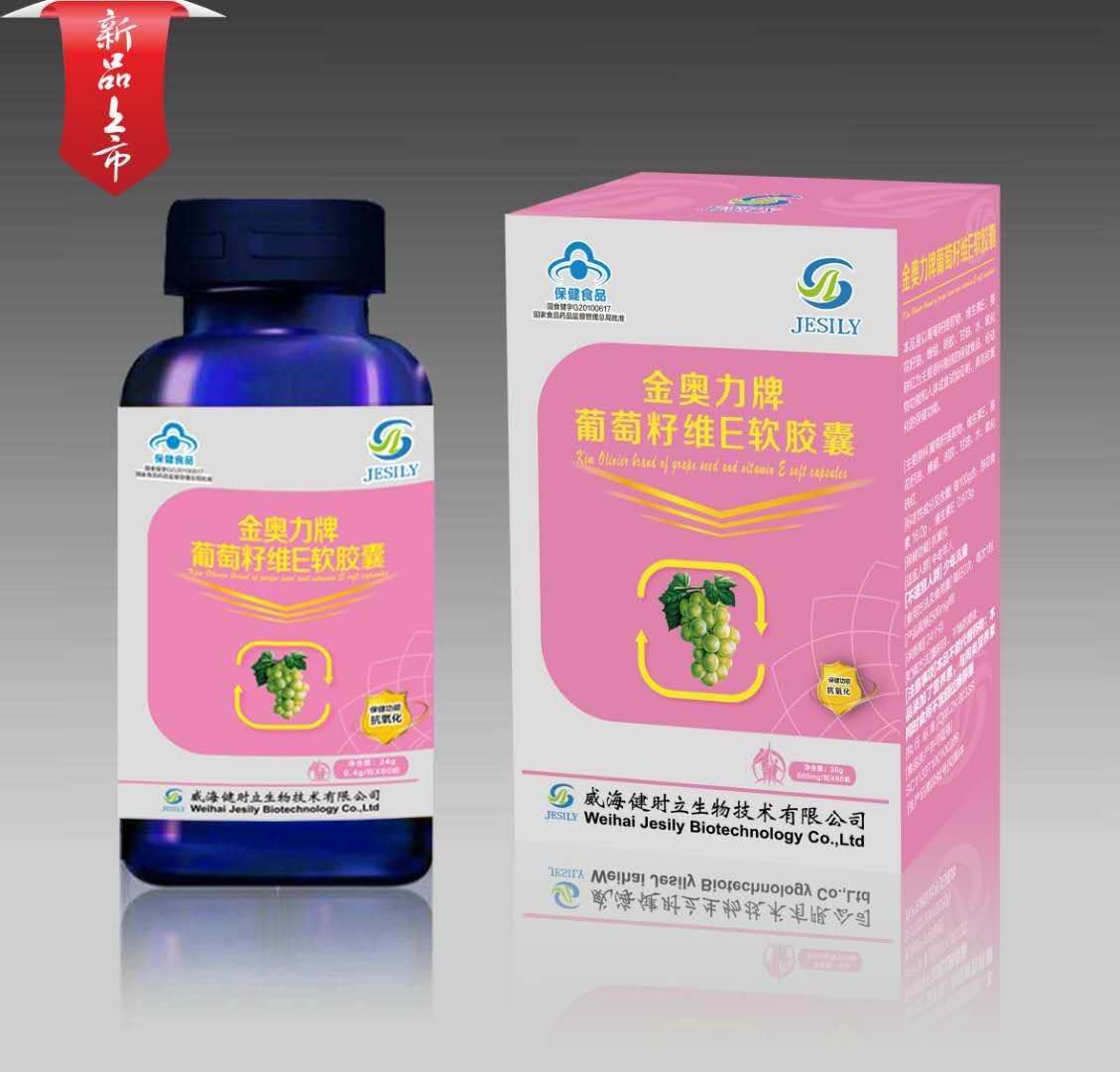 本品是以葡萄籽提取物、维生素E、葵花籽油、蜂蜡、明胶、甘油、水、氧化铁红为主要原料制成的保健食品,经动物功能和人体试食试验证明,具有抗氧化的保健功能.